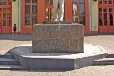 Это памятник Ленину на железнодорожном вокзале. Какую руку вождь протягивает вперед?